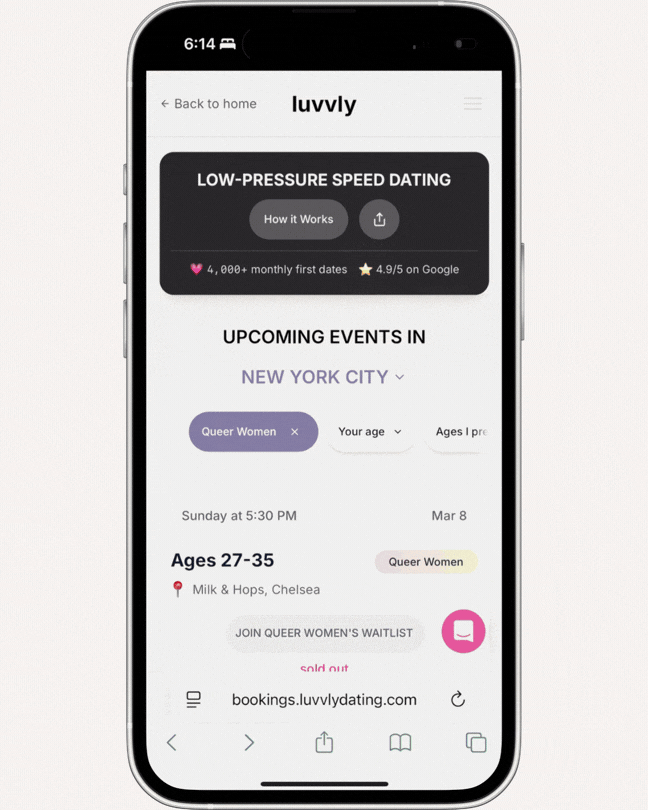 Pick an event with an age bracket you’re looking for (we host sapphic events from mid 20’s to mid 60’s). Register to lock in your spot or join the waitlist if it’s sold out.